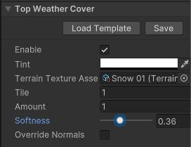 Move your asset to the scene and hover zoom in on the asset. Now add some Snow in the Top Weather Cover of the TerraformerGenerator. If everything works correctly, you should be able to see snow on your scene.